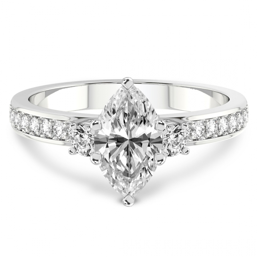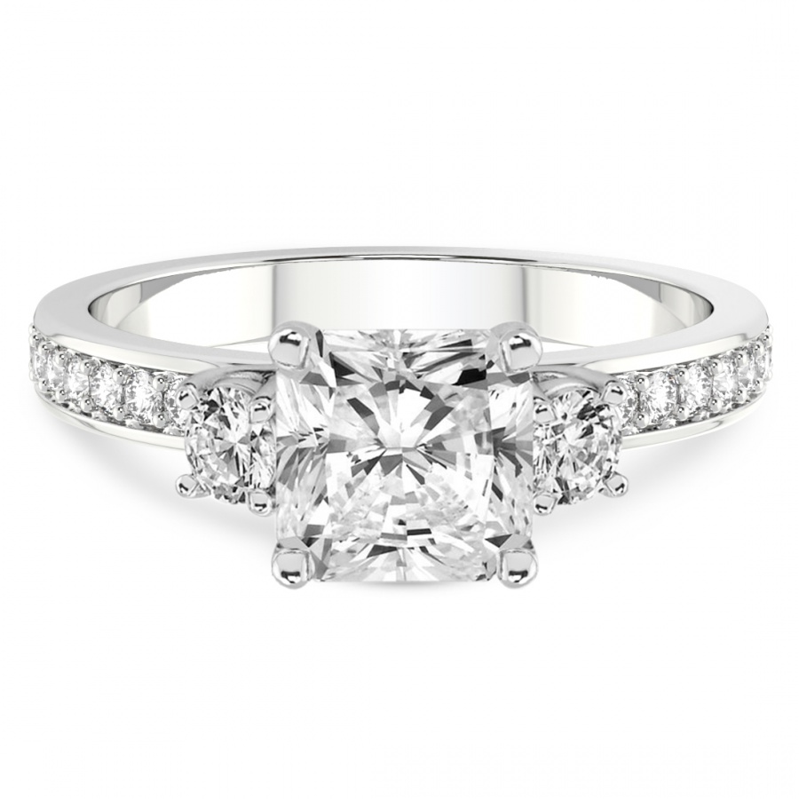 This Camila Three Stone Lab Diamond Ring is a Emerald shape ring Engagement type pt White Gold