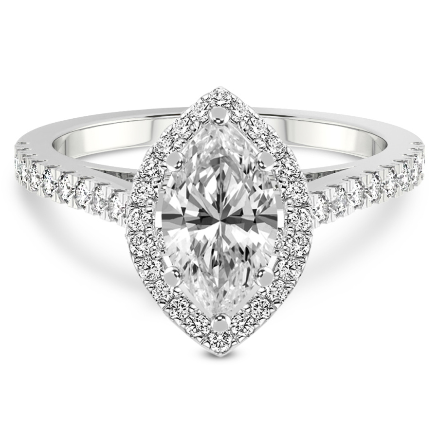 This Maya Three Stone Side Cushion Diamond Ring is a Marquise shape ring Engagement type 18k White Gold