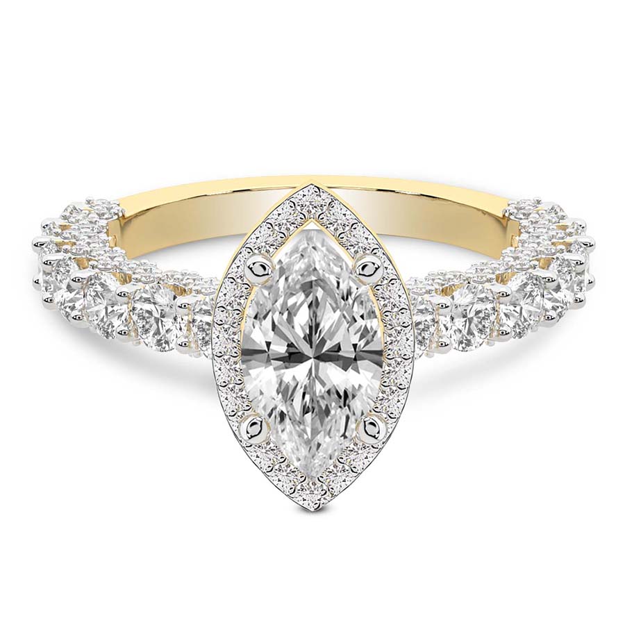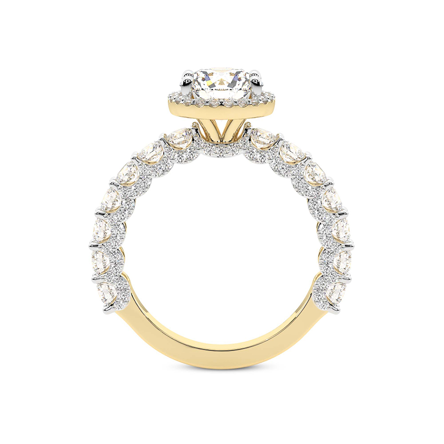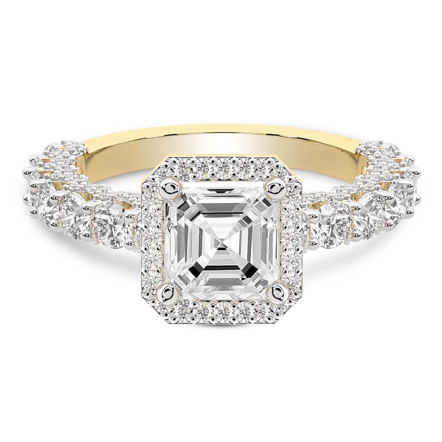 This Zinnia Side Stones Halo Diamond Ring is a Princess shape ring Engagement type 18k Yellow Gold