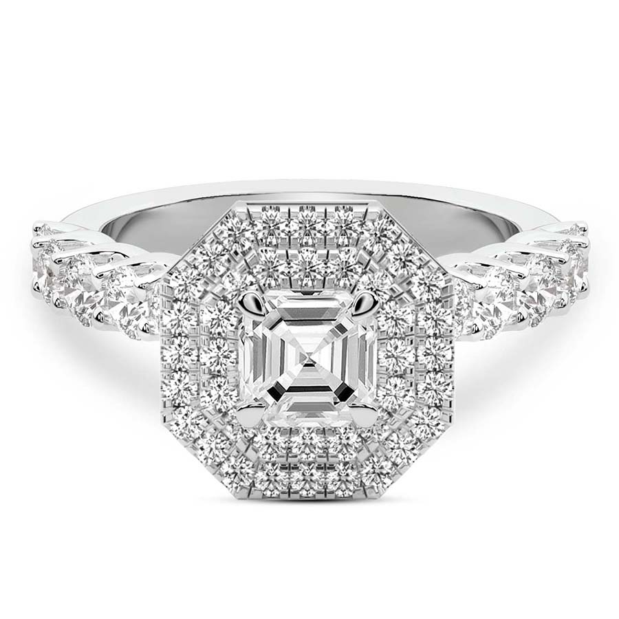 This Yvette Cresta Double Halo Lab Diamond Ring is a Asscher shape ring Engagement type 18k White Gold