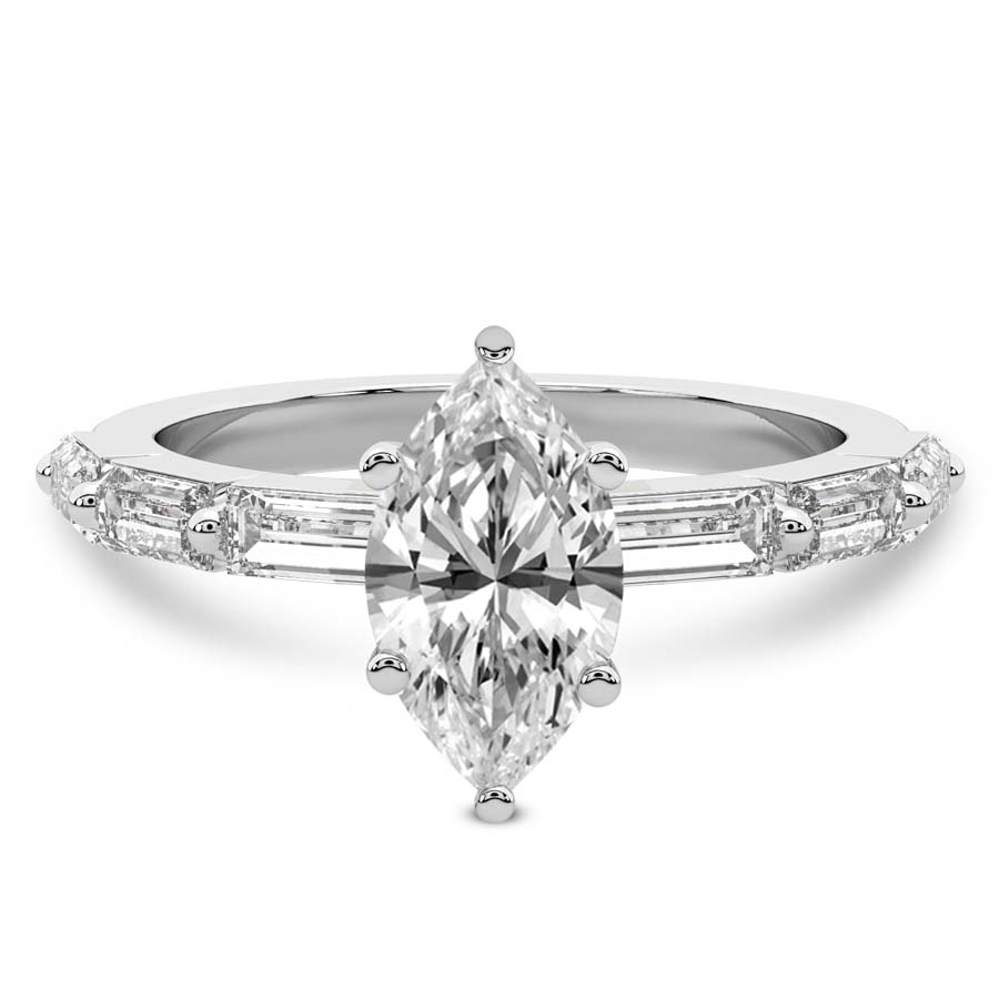 This Bella Baguette Side Stone Ring is a Marquise shape ring Engagement type 18k White Gold