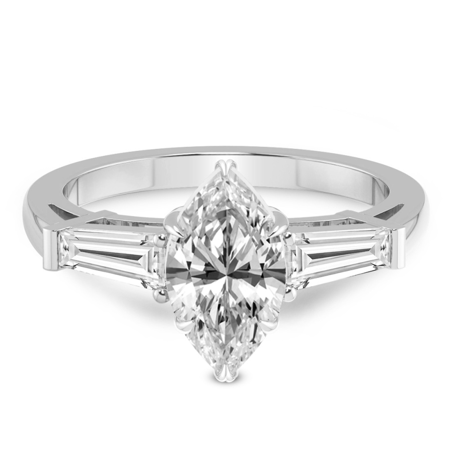 This Mabel Three Stone Side Baguette Diamond Ring is a Marquise shape ring Engagement type 18k White Gold