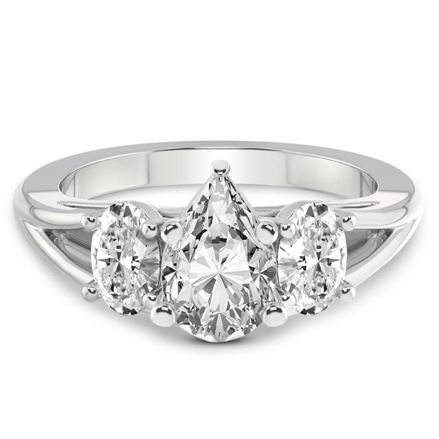 This Famie Three Stone Side Oval Diamond Ring is a Pear shape ring Engagement type 18k White Gold