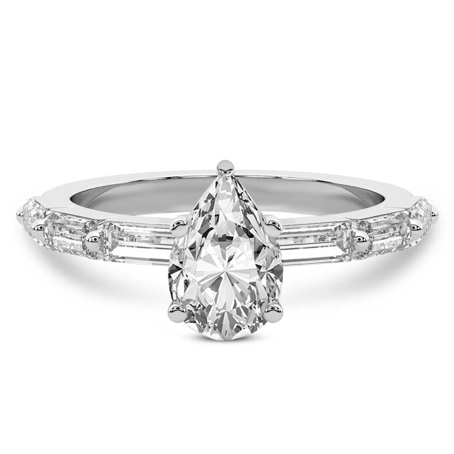 This Bella Baguette Side Stone Ring is a Pear shape ring Engagement type 18k White Gold
