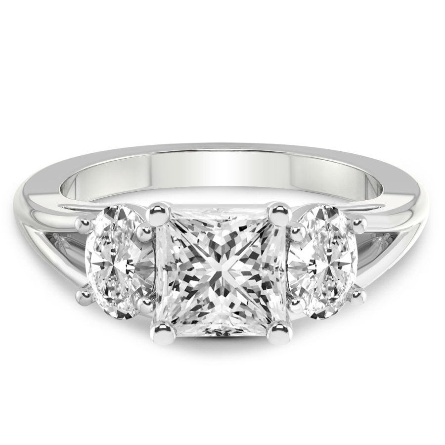 This Famie Three Stone Side Oval Diamond Ring is a Princess shape ring Engagement type 18k White Gold