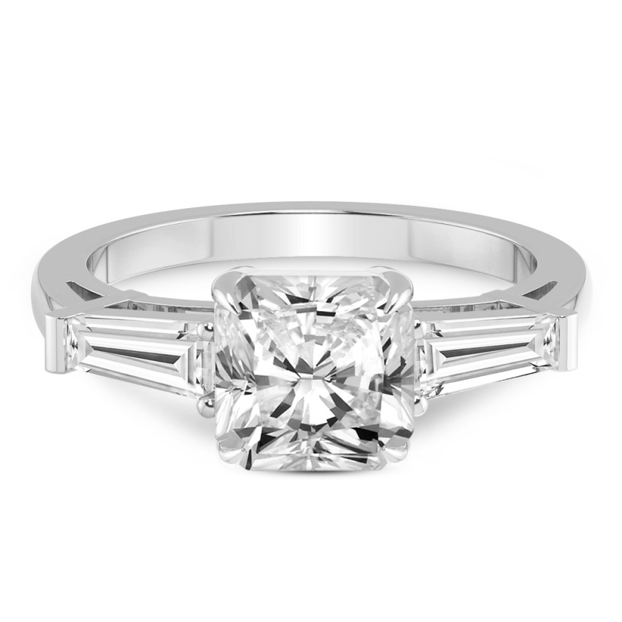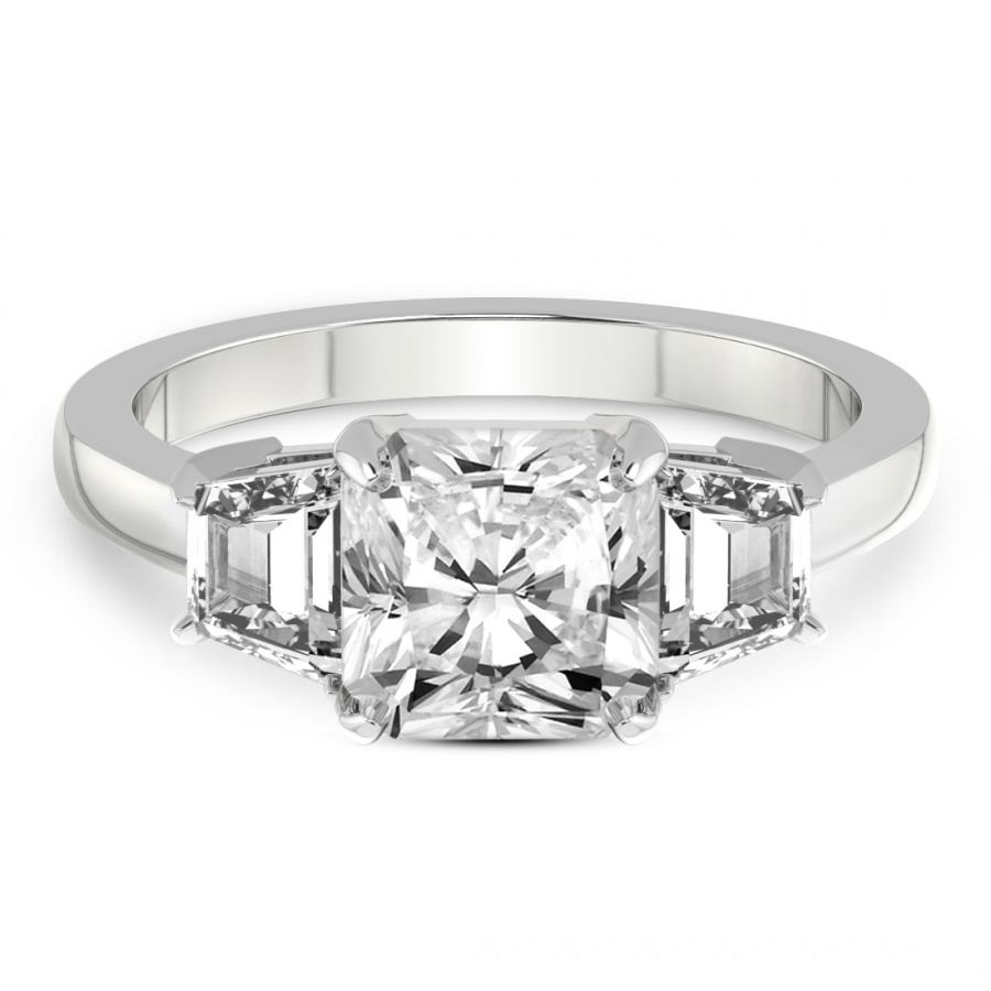 This Fiona Three Stone Side Trapezium Diamond Ring is a Radiant shape ring Engagement type 18k White Gold