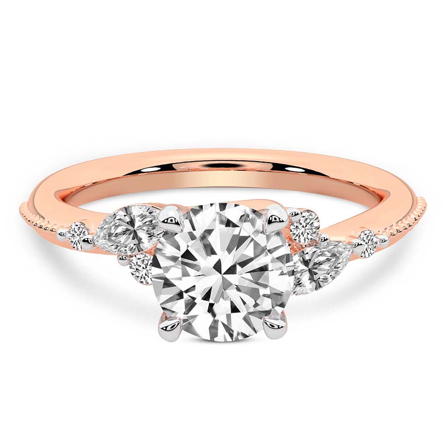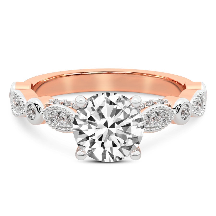 This Renée Milgrain Diamond Ring is a Round shape ring Engagement type 18k Rose Gold