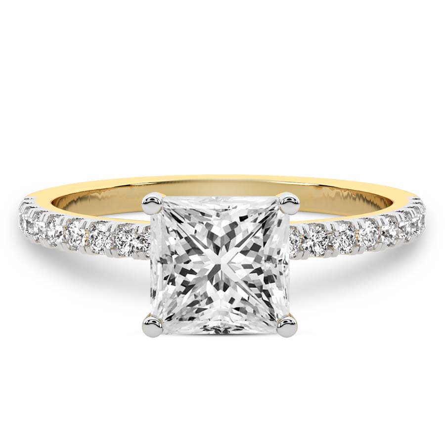 This Amelia Side Stone Ring is a Princess shape ring Engagement type 18k Yellow Gold