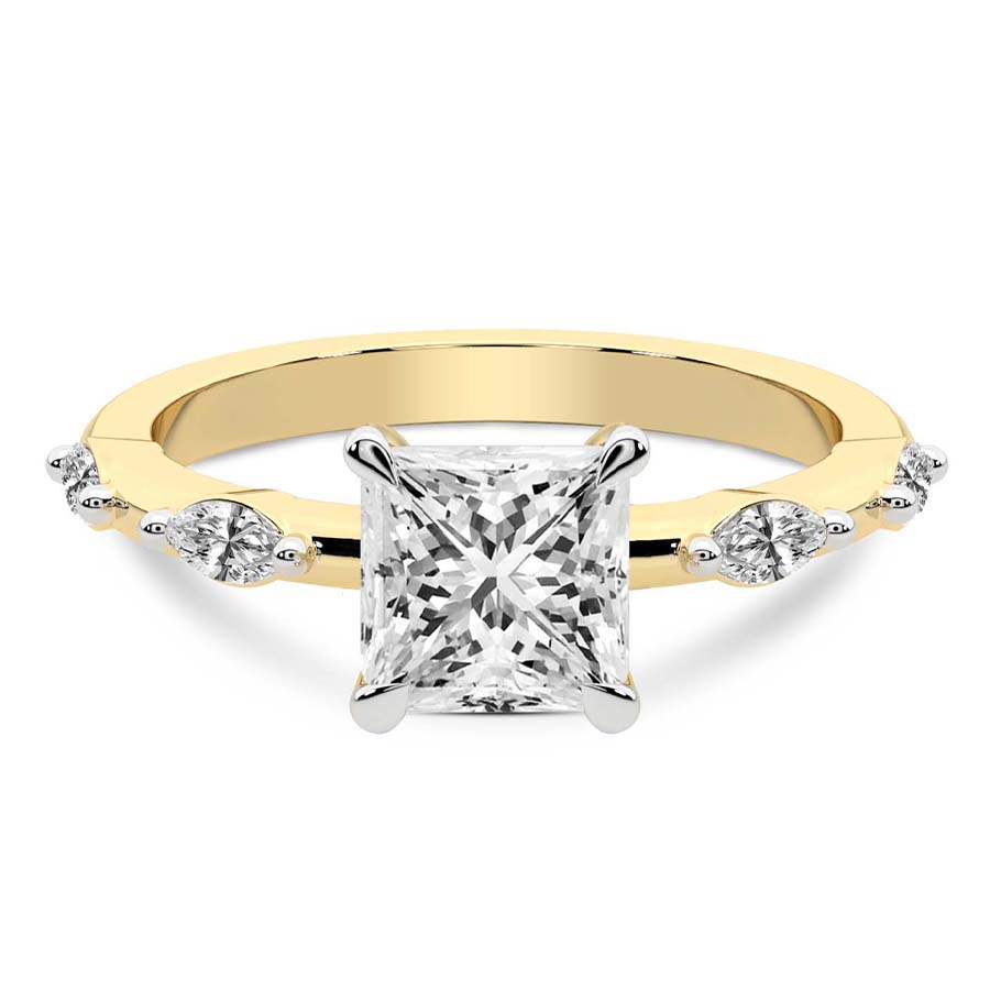 This Nerissa Marquise Side Stone Ring is a Princess shape ring Engagement type 18k Yellow Gold