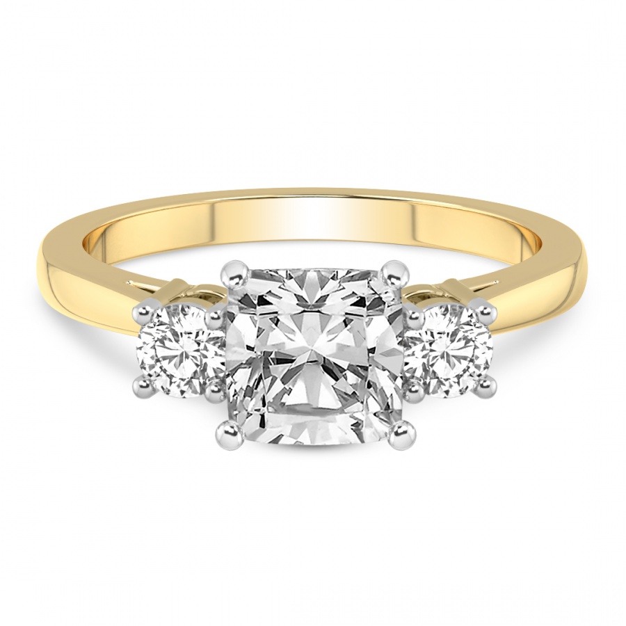 This Violet Three Stone Diamond Ring is a Cushion shape ring Engagement type 18k Yellow Gold