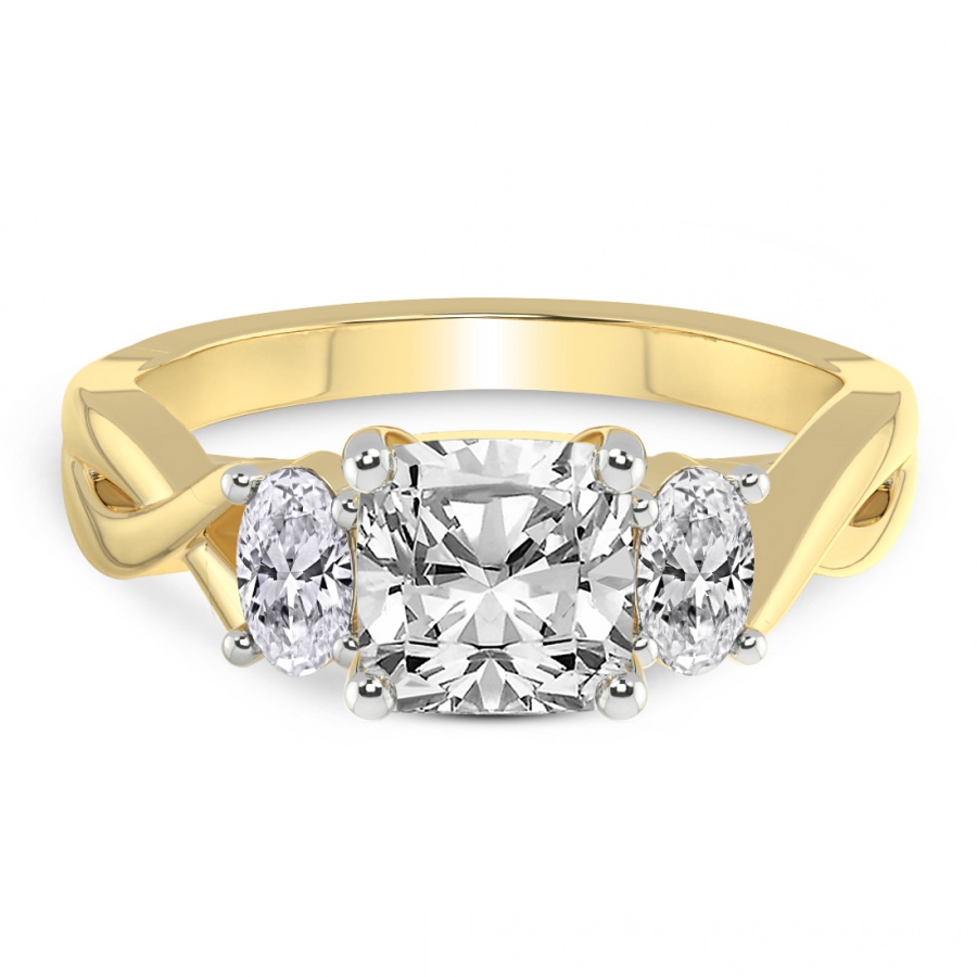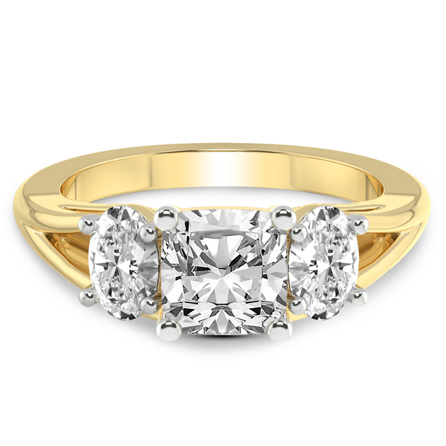 This Famie Three Stone Side Oval Diamond Ring is a Cushion shape ring Engagement type 18k Yellow Gold
