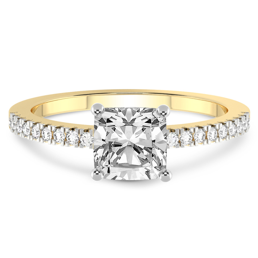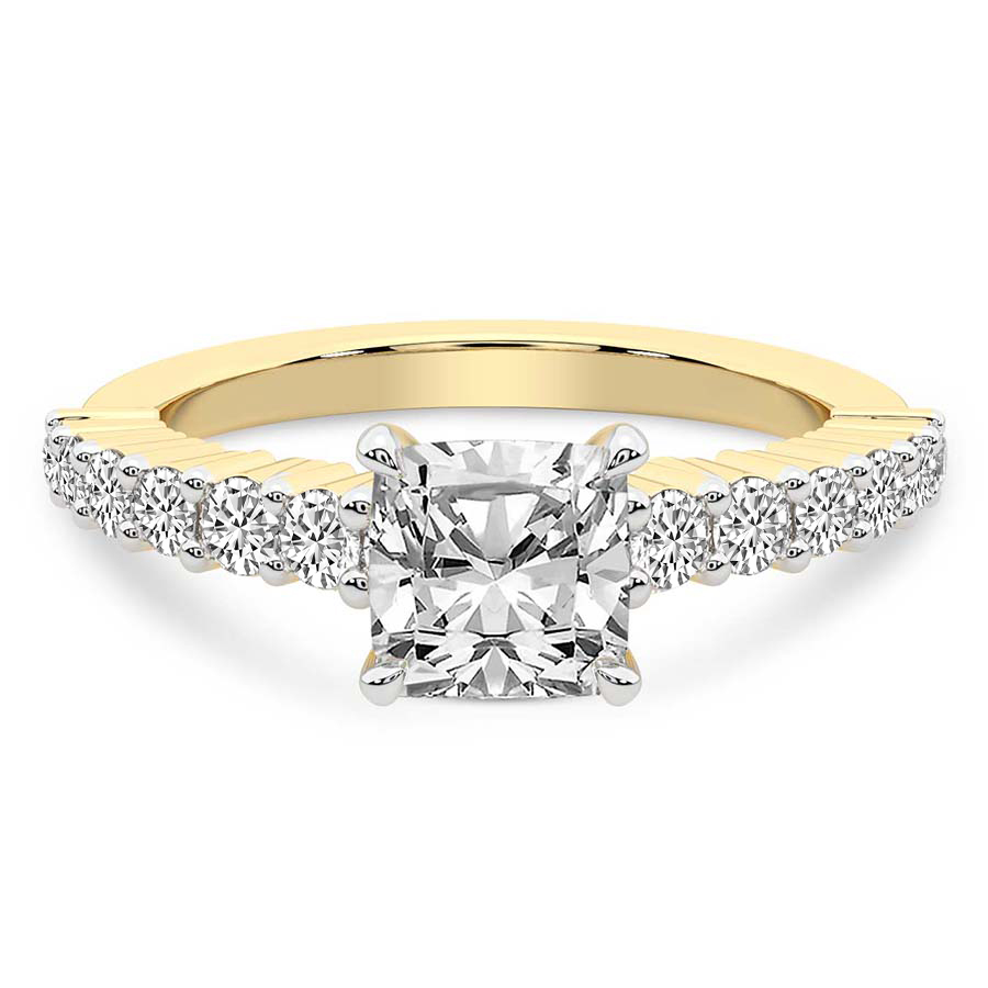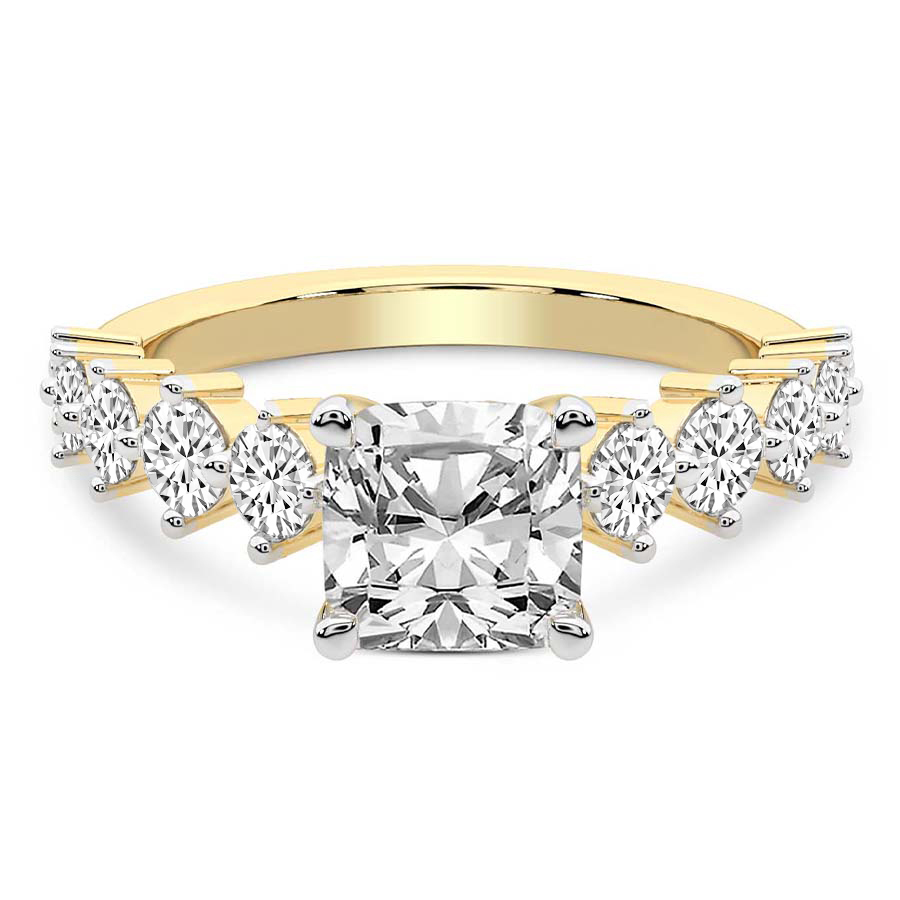 This Madelyn Four Claw Side Stone Ring is a Cushion shape ring Engagement type 18k Yellow Gold