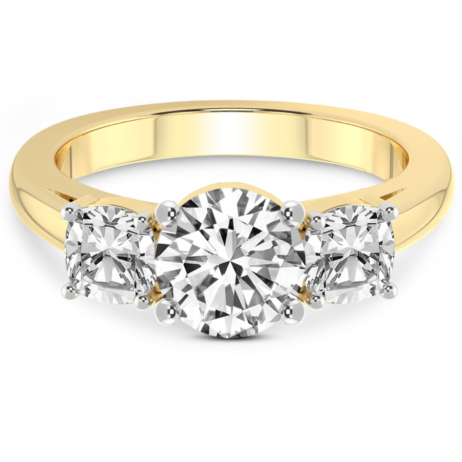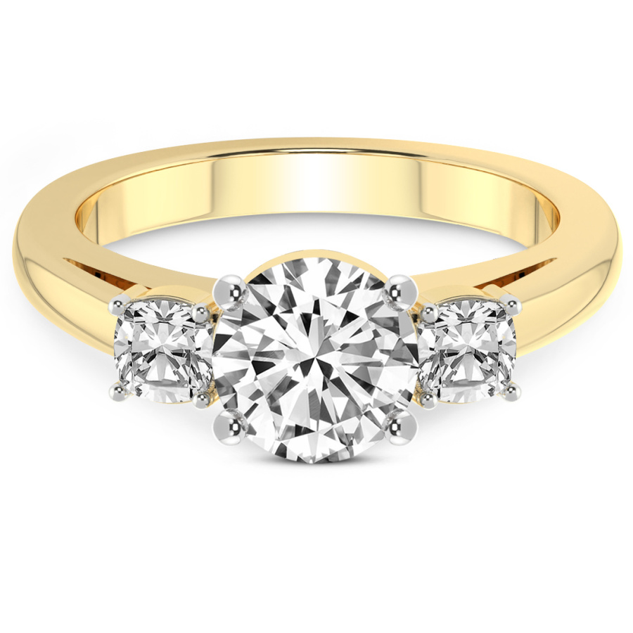 This Alice Three Stone Side Cushion Diamond Ring is a Round shape ring Engagement type 18k Yellow Gold