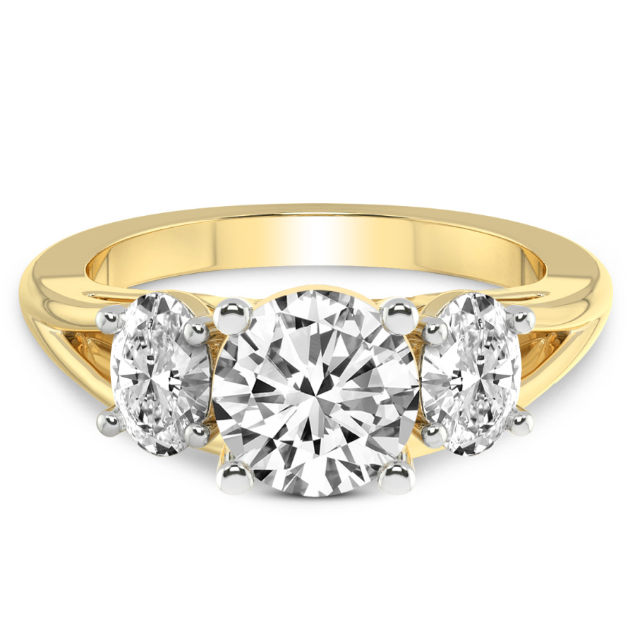 This Famie Three Stone Side Oval Diamond Ring is a Round shape ring Engagement type 18k Yellow Gold