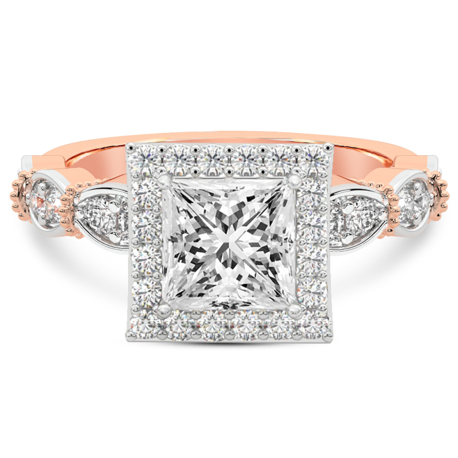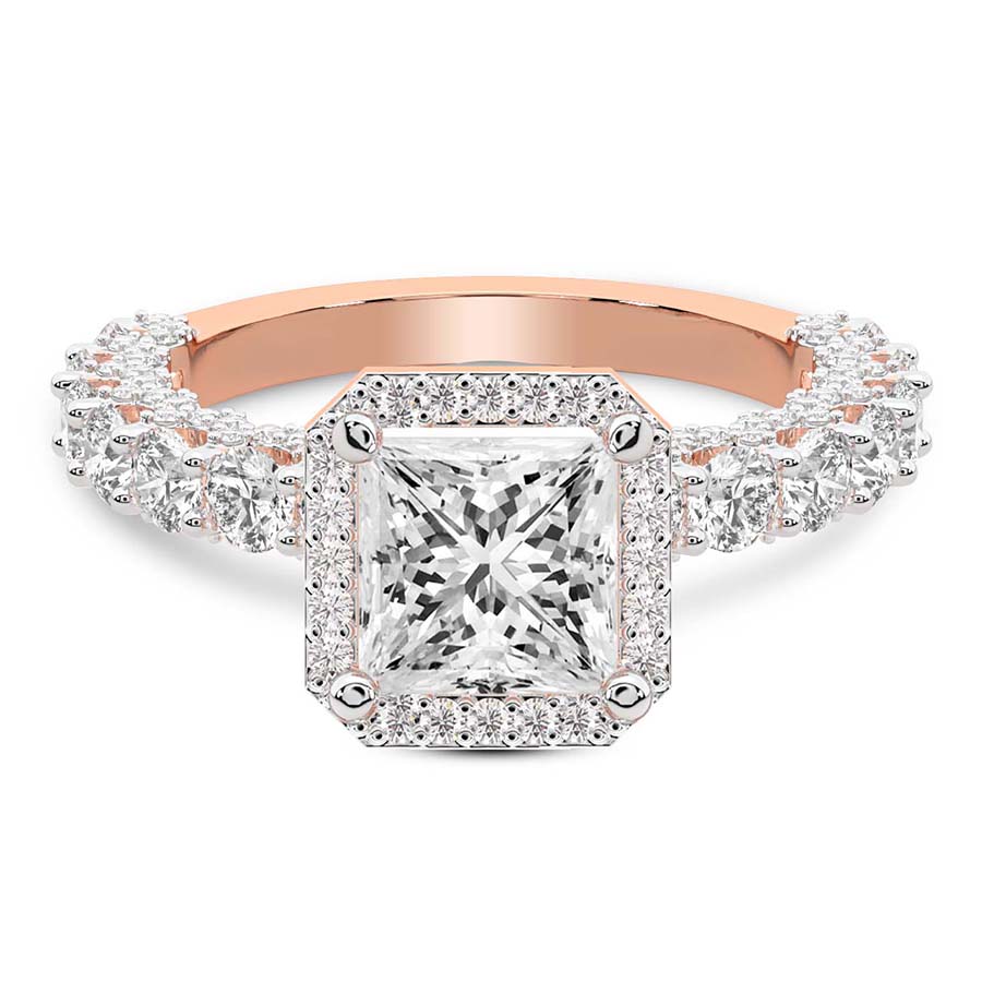 This Zinnia Side Stones Halo Diamond Ring is a Princess shape ring Engagement type 18k Rose Gold