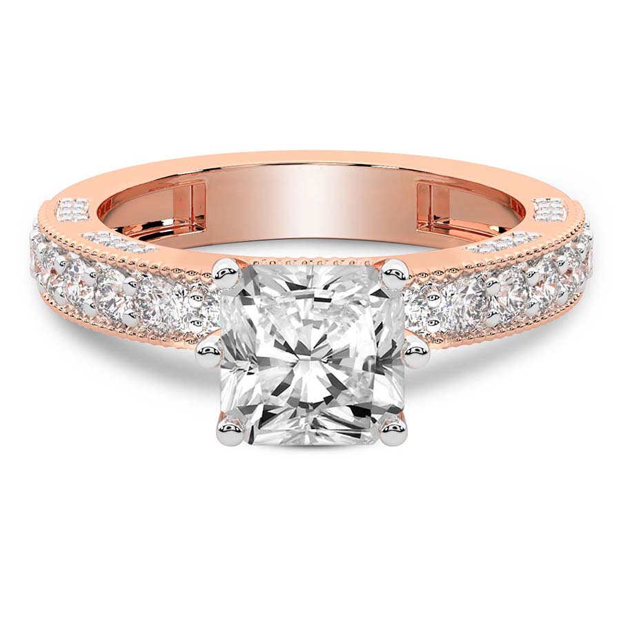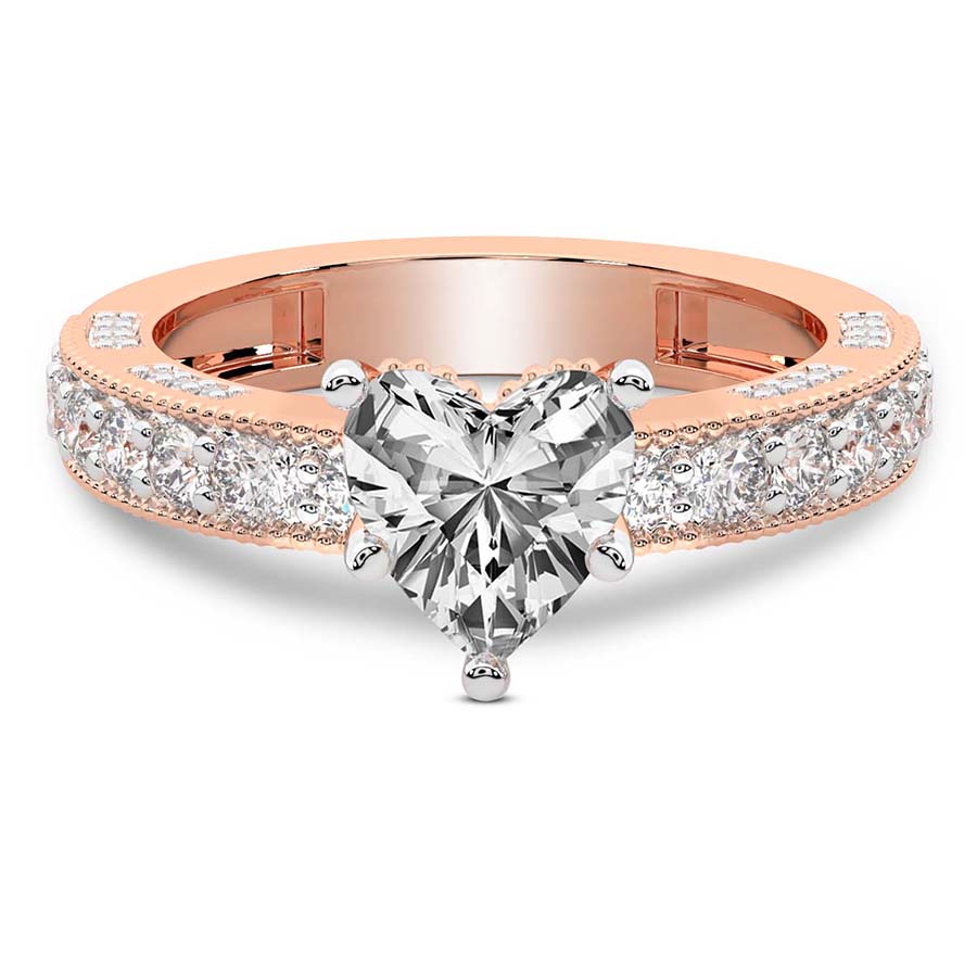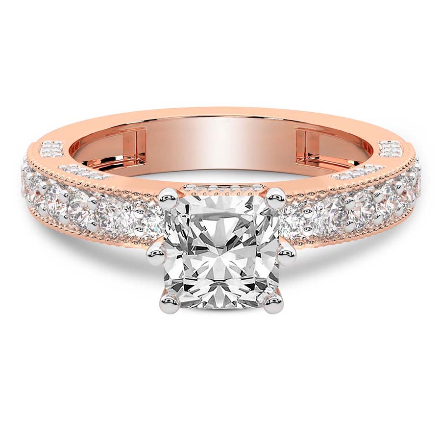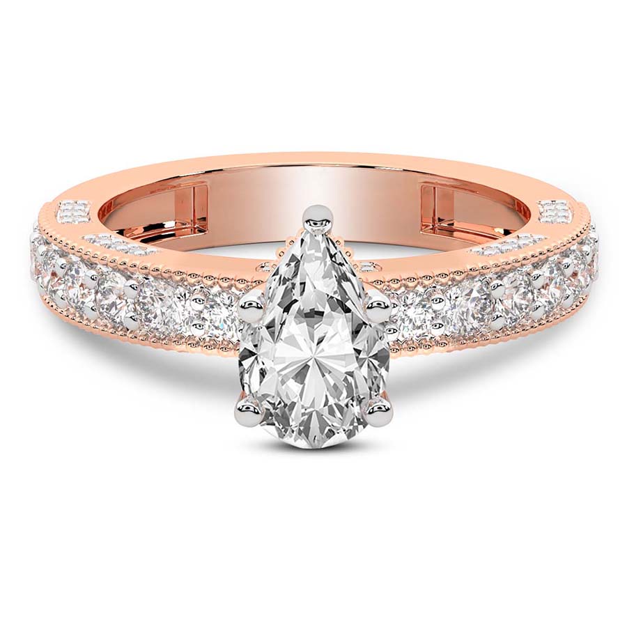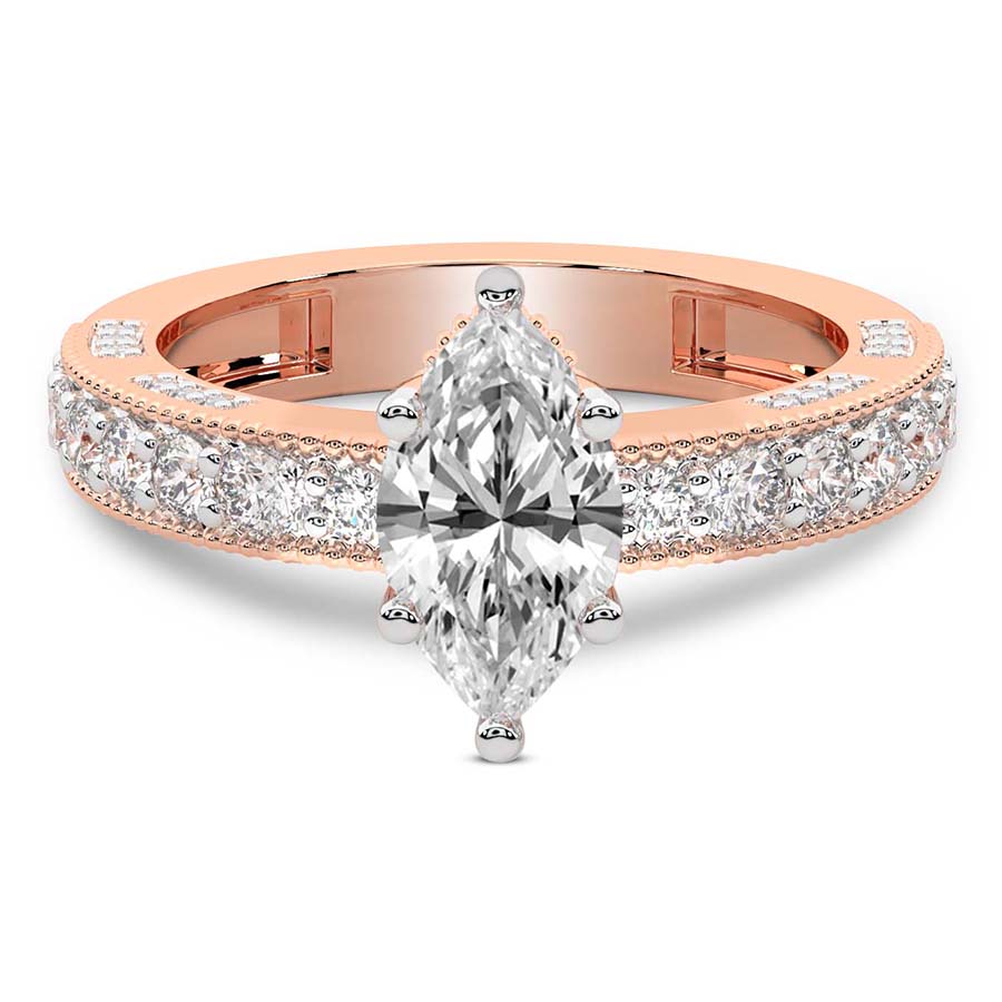 The Eleanor Milgrain Diamond Ring is a masterpiece of timeless romance and sophisticated artistry. Cast in the warm, blushing glow of exquisite 18k rose gold, this ring offers a breathtaking alternative to traditional settings, perfect for the modern woman who cherishes vintage-inspired elegance. At its heart lies a magnificent round brilliant diamond, expertly selected for its fire and brilliance. This central stone is cradled in a setting that celebrates both light and texture, creating a captivating sparkle that commands attention from every angle. The hallmark of the Eleanor design is its intricate milgrain detailing, a delicate beaded texture that traces the edges of the band and setting with precision. This artisanal touch evokes a sense of antique charm while maintaining a clean, contemporary silhouette. The choice of 18k rose gold enhances the natural warmth of the diamond, offering a soft contrast that feels both luxurious and intimate. Every curve of this ring is polished to perfection, ensuring a comfortable fit that feels as sublime as it looks. Whether you are marking a lifetime commitment or celebrating a significant milestone, this round shape engagement ring stands as a symbol of enduring love. The combination of classic craftsmanship and modern luxury makes the Eleanor Milgrain Diamond Ring a heritage piece to be treasured for generations. Embrace the allure of refined jewelry with this stunning 18k rose gold creation, designed for those who demand nothing less than perfection in their pursuit of timeless beauty and exceptional brilliance.