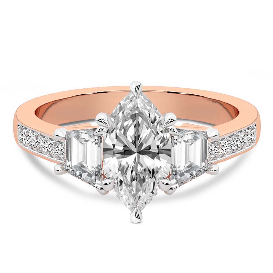 The Madeleine Trapezoid Three Stone Engagement Ring is a testament to refined artistry and timeless romance. Expertly fashioned in lustrous 18k rose gold, this exquisite piece marries contemporary architectural precision with a classic silhouette. At its heart sits a magnificent round brilliant-cut diamond, chosen for its exceptional fire and unrivaled sparkle. This central masterpiece is flanked by two perfectly matched step-cut trapezoid diamonds, which create a seamless transition of light and accentuate the center stone's natural grandeur. The warm, blush tones of the 18k rose gold provide a sophisticated backdrop, enhancing the icy brilliance of the diamonds and offering a unique alternative to traditional metals. Every detail of the Madeleine ring has been meticulously considered, from the slender, polished band to the secure yet delicate setting that allows for maximum light exposure. This three-stone design symbolizes a couple’s past, present, and future, making it an evocative choice for a lifelong commitment. Whether you are drawn to its geometric harmony or its romantic allure, this ring stands as a pinnacle of luxury craftsmanship. Designed for the discerning individual who appreciates subtle opulence, the Madeleine Trapezoid Three Stone Ring is more than just jewelry; it is a legacy piece meant to be cherished for generations. Experience the perfect harmony of modern design and heritage quality with this breathtaking 18k rose gold creation that promises to capture hearts and illuminate every moment of your shared journey.