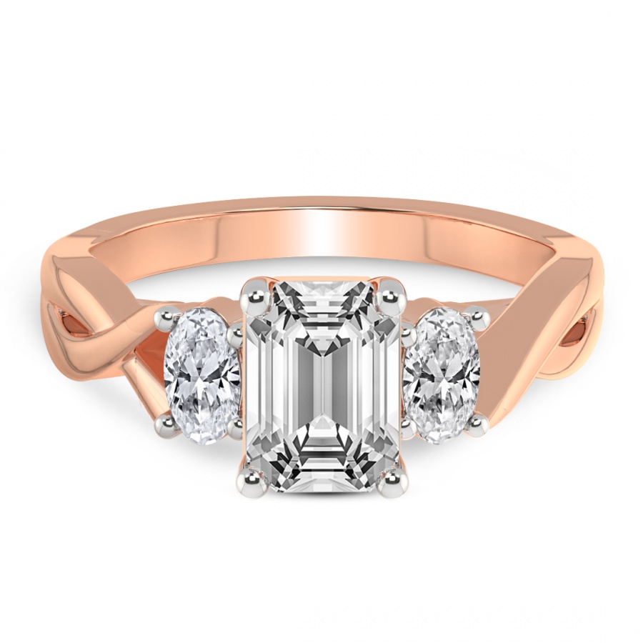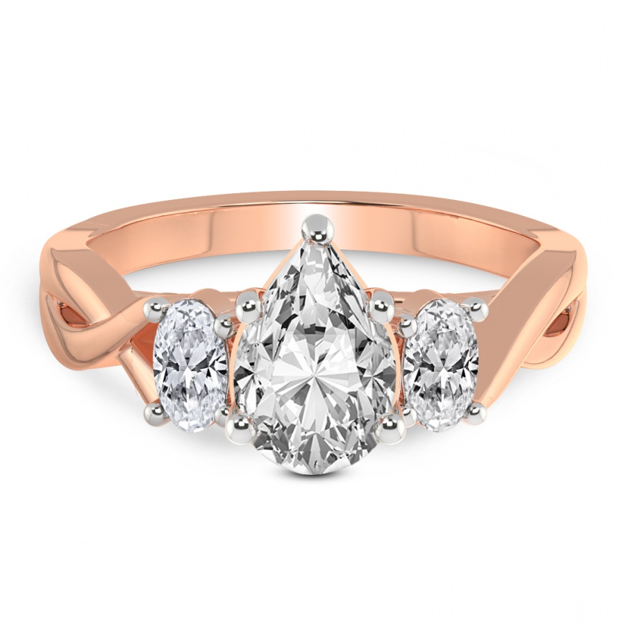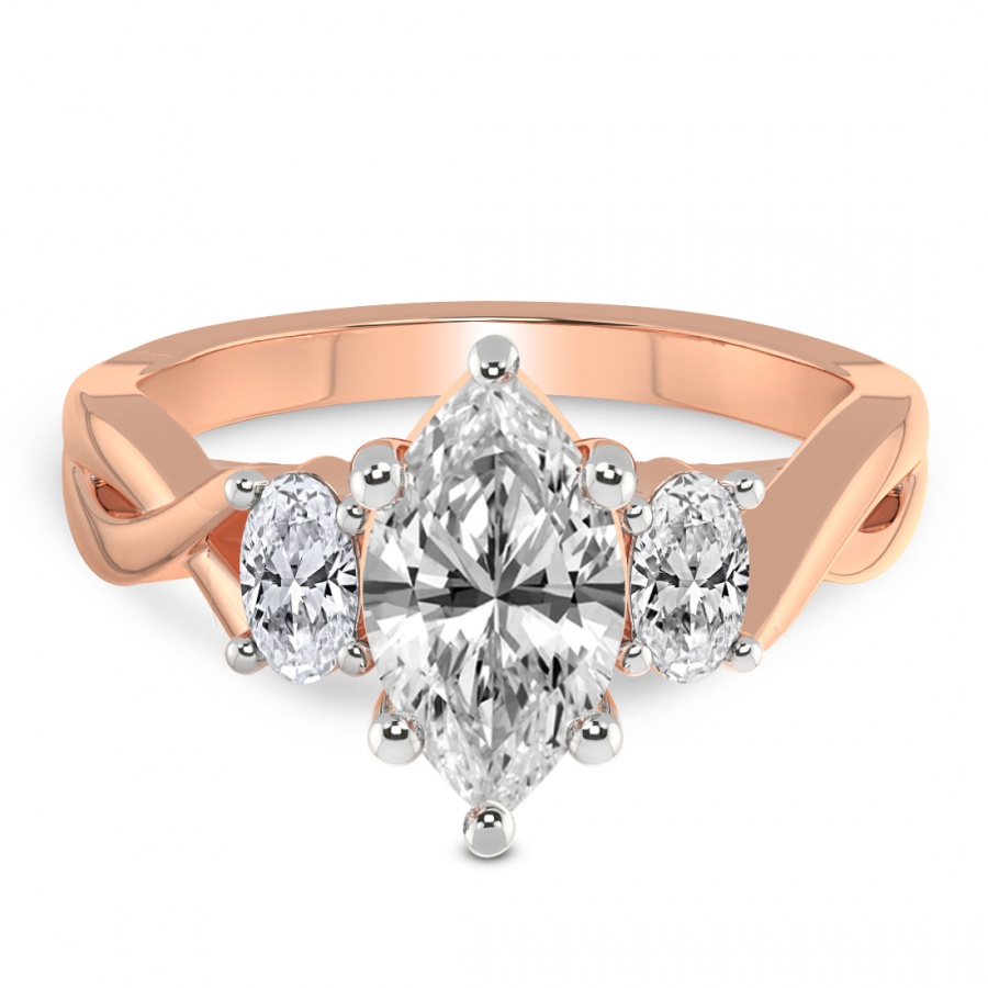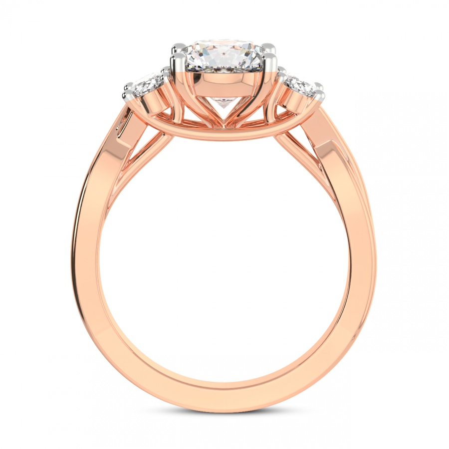 The Noorie Three-Stone Side Oval Diamond Ring is a sublime embodiment of romantic sophistication and master craftsmanship. At the heart of this exquisite piece lies a magnificent round brilliant-cut center diamond, renowned for its unparalleled fire and exceptional luminosity. This central masterpiece is elegantly flanked by two perfectly proportioned oval-shaped side diamonds, creating a graceful silhouette that maximizes sparkle and visual depth. Cast in the warm, ethereal glow of 18k rose gold, the setting offers a contemporary twist on the classic trilogy design, symbolizing the past, present, and future of a shared journey. The delicate blush tones of the precious metal harmonize beautifully with the icy brilliance of the diamonds, making it a distinctive choice for the modern bride who seeks both tradition and individuality. Every facet is meticulously polished to ensure that the ring captures the light from every angle, radiating a captivating brilliance that is impossible to ignore. This handcrafted engagement ring is not merely a piece of jewelry but a timeless heirloom designed to be cherished for a lifetime. Whether you are celebrating an eternal promise or a milestone moment, the Noorie ring stands as a testament to enduring love and refined luxury. Its balanced proportions and luxurious finish make it a versatile yet striking statement piece that complements any style with effortless grace and prestige.