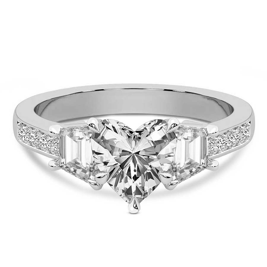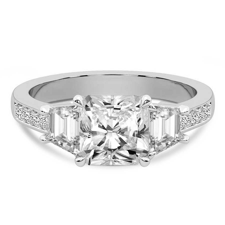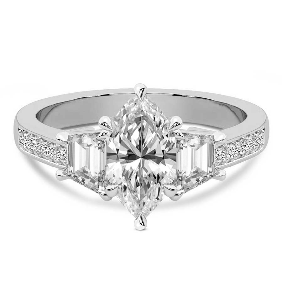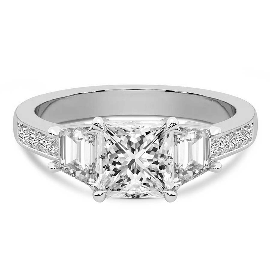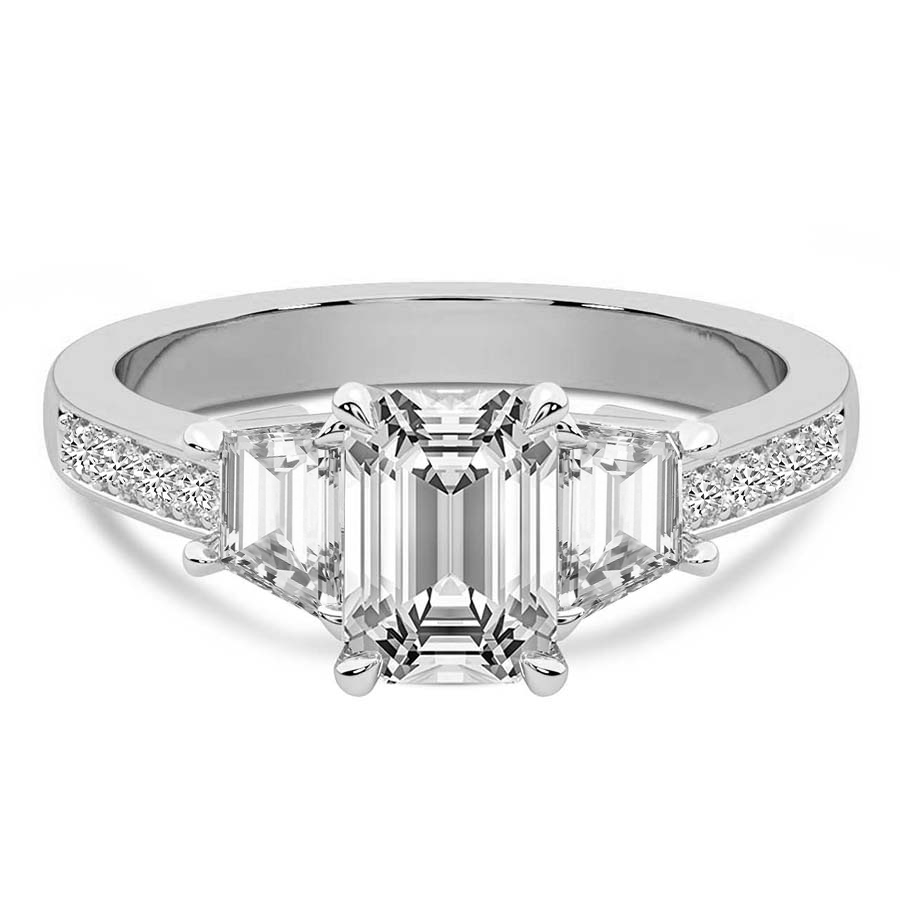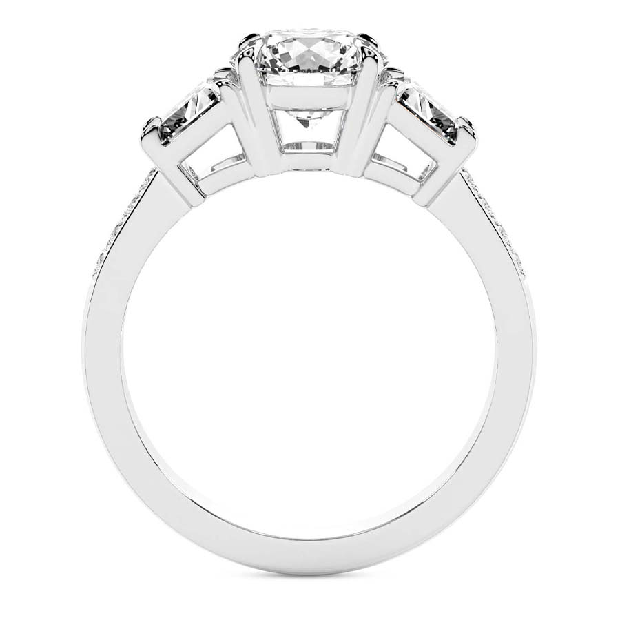 The Madeleine Trapezoid Three Stone Engagement Ring represents the ultimate confluence of classical romance and contemporary architectural design. Crafted from the finest hallmarked platinum, this exquisite piece features a magnificent round brilliant cut center diamond that captures and reflects light with unrivaled intensity. Flanking the central stone are two perfectly matched trapezoid side diamonds, meticulously selected to create a sleek, tapered silhouette that draws the eye toward the primary gem. This sophisticated trilogy design symbolizes your shared past, present, and future, making it a profound choice for a lifetime commitment. The lustrous platinum setting provides a secure and enduring foundation, its cool white brilliance enhancing the natural fire of each diamond. Every facet is expertly polished by master artisans to ensure a finish that radiates luxury from every angle. The seamless transition between the round center and the geometric side stones offers a modern twist on the traditional three stone ring, catering to the bride who seeks a balance of timeless grace and bold individuality. Whether presented as a surprise proposal or chosen together, the Madeleine ring stands as a testament to enduring love and impeccable taste. Its substantial yet refined profile ensures it will remain a cherished heirloom for generations to come. Experience the pinnacle of British craftsmanship with a piece that defines elegance and serves as a shimmering beacon of your unique love story and personal style.